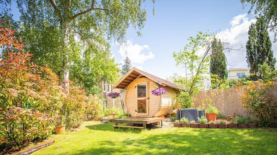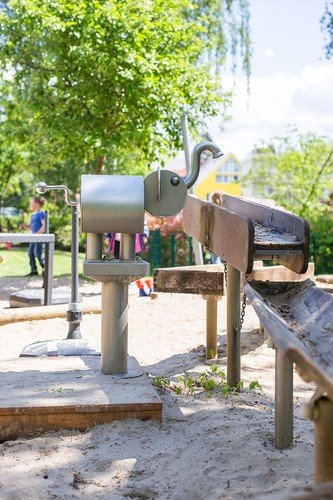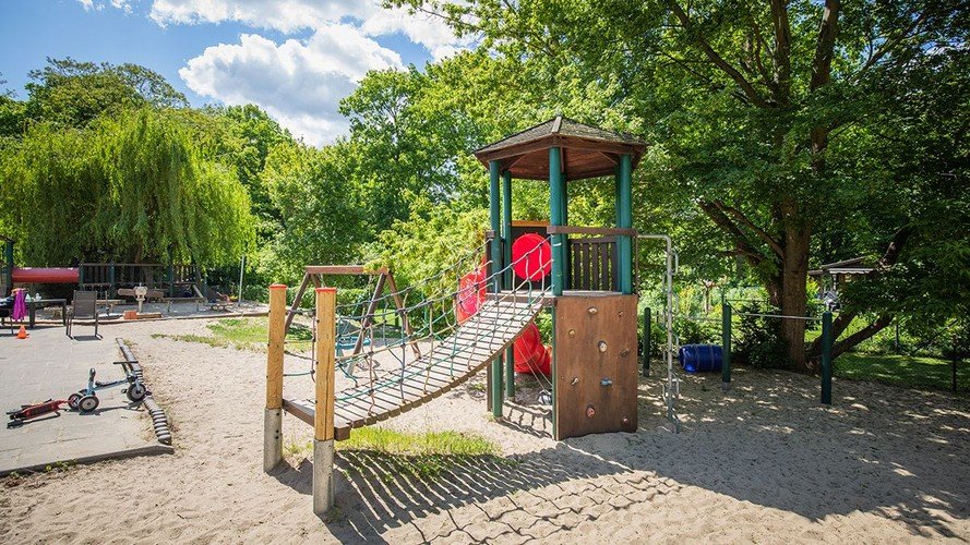 Unser besonders große Garten lädt die Kinder ein, sich am Wasserelefanten oder an den unterschiedlichen Spielgeräten auszuprobieren. Ein weiteres Schmuckstück ist unsere Fass-Sauna.
