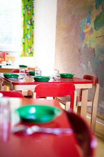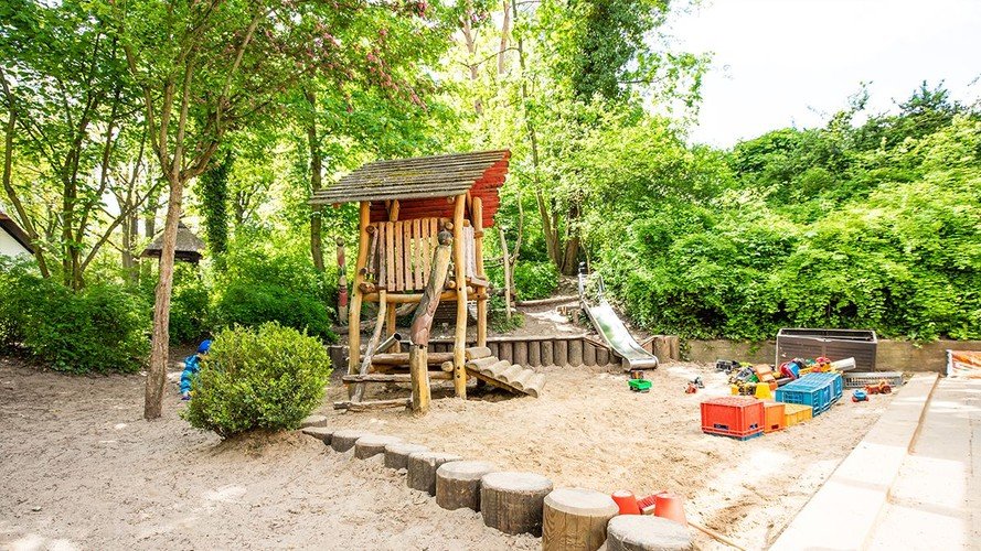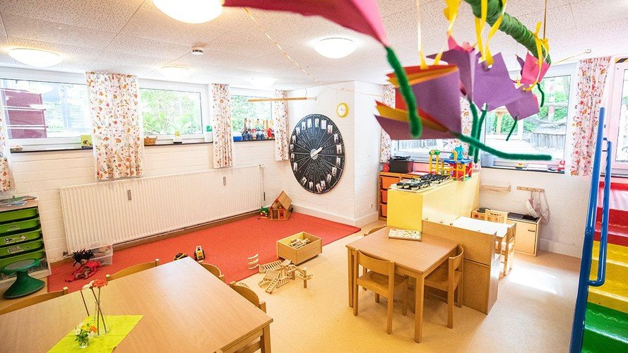 Die Kita bietet den Kindern ein kleines Außengelände mit Spielgeräten. Uns stehen im Souterrain des Gemeindehauses ein großer Gruppenraum und ein kleiner Ausweichraum zum Spielen zur Verfügung. Garderobe, Wickelraum und Waschraum befinden sich ebenfalls dort. Unser Speiseraum liegt im ersten Obergeschoss des Gemeindehauses, direkt neben der Verteilerküche.