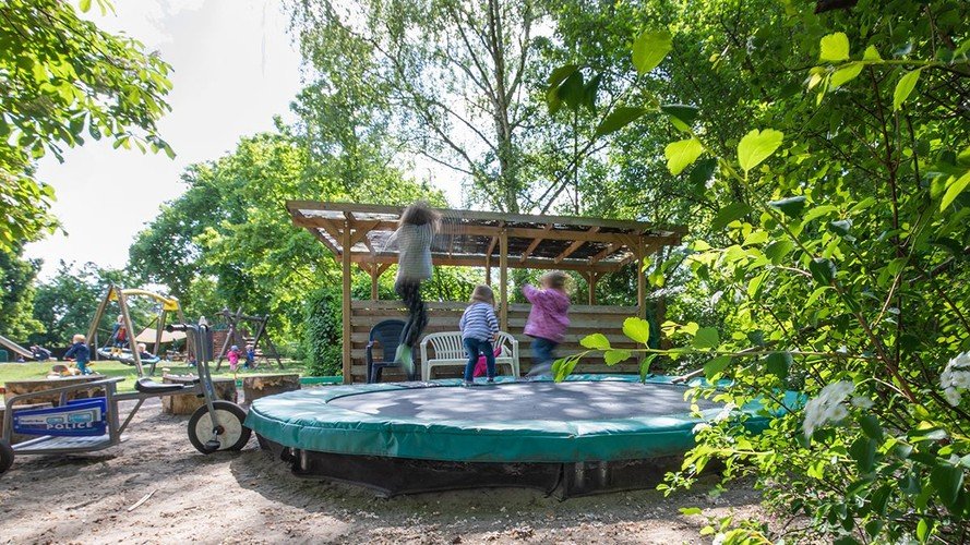Die Kindertagesstätte verfügt über einen großen Garten. Neben Spielgeräten und einem Wasserspiellauf haben die Kinder die Möglichkeit, in der Natur zu spielen. Zusätzlich stehen ein Bauwagen als Holzwerkstatt und zwei Fußballtore im Garten.