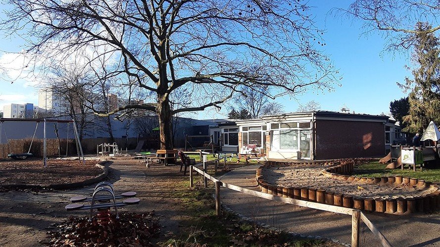 Zur Kita gehört ein eigener Garten mit zum Großteil naturnah gestalteten Spielgeräten.
